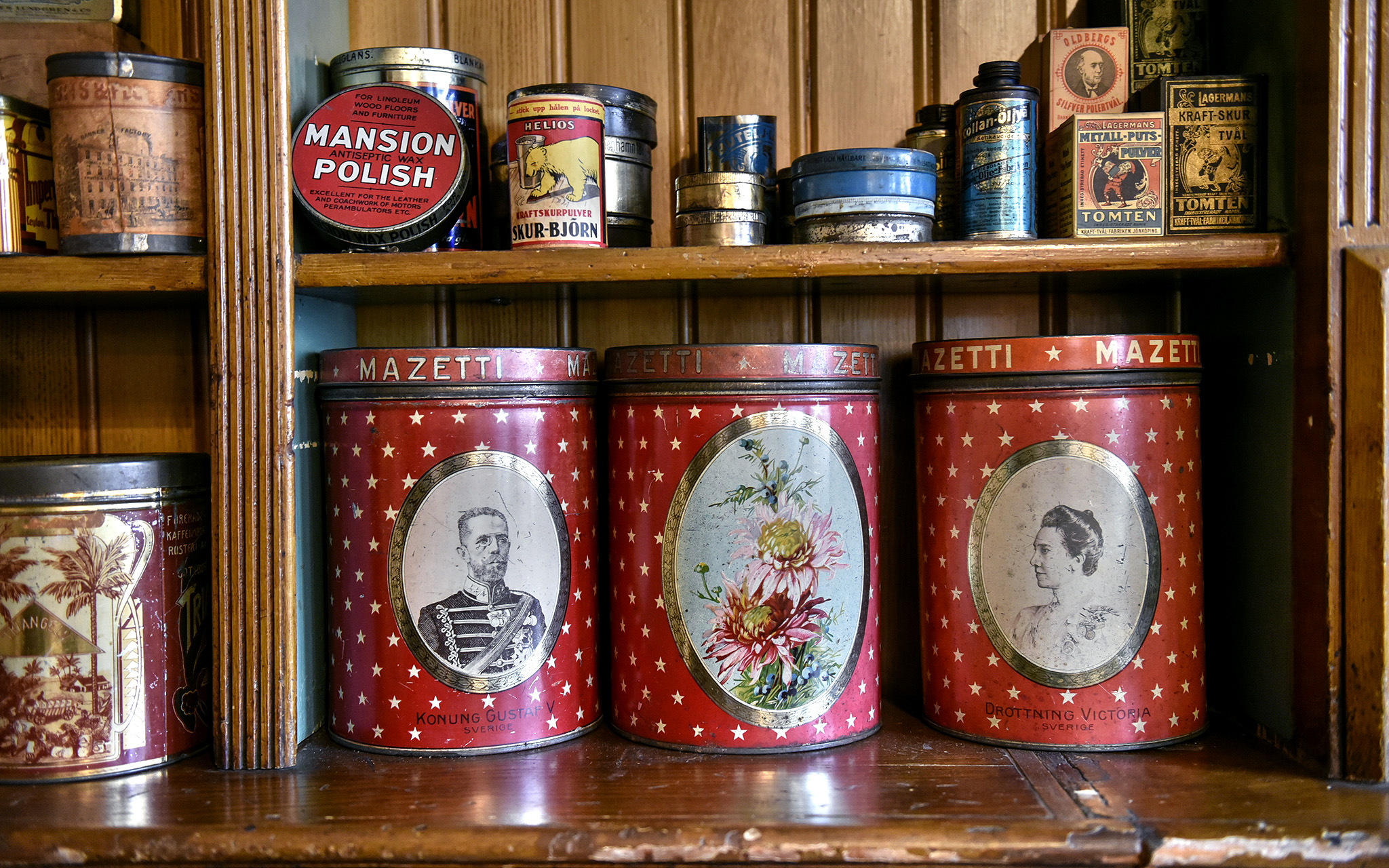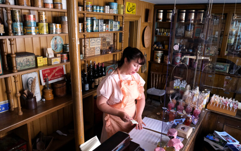 I Kulturens butik Hökeriet kan du köpa gammaldags varor med anknytning till förra sekelskiftet, bland annat saft, sylt och karameller i strut. På hyllorna kan du se förpackningar från samma tidsperiod. Välkommen in!