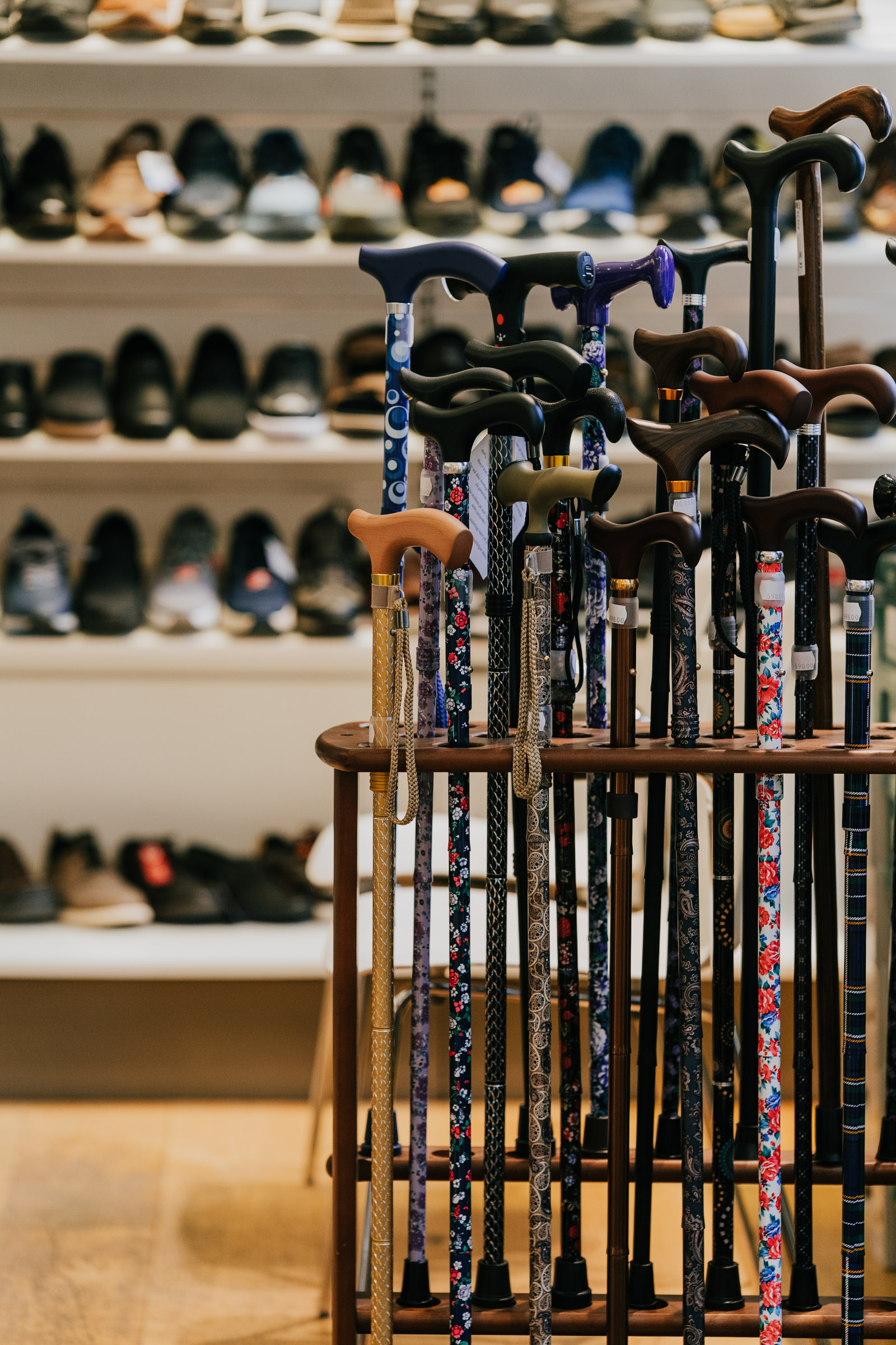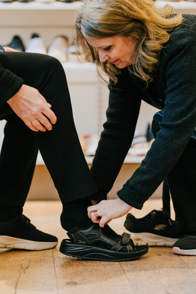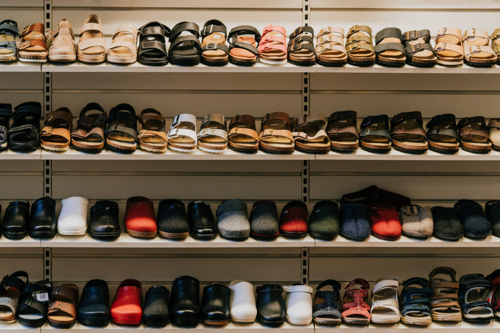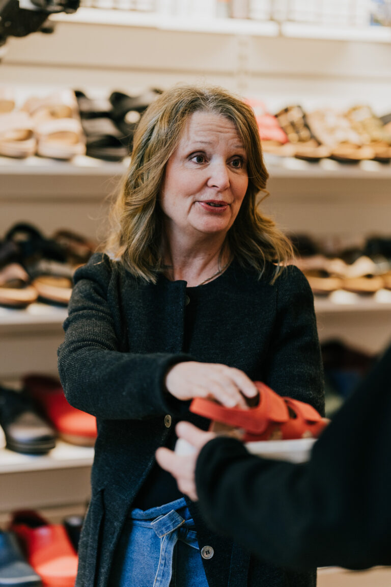 Under fina dagar ställer vi ut skor på fönsterbläcket vilket gjort oss välkända här på Stora Gråbrödersgatan. Butiken är liten men utbudet av skor är stort. Vi har olika modeller för både inom- och utomhusbruk, till arbete och fritid samt skor med uttagbara sulor för egna inlägg.